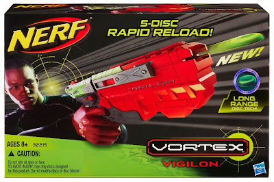 Através da caixa é possível afirmar que a Nerf Vigilon suporta 5 discos e é uma arma de recarregamento rápido, pois possui o mesmo sistema de engatilhamento da Maverick.